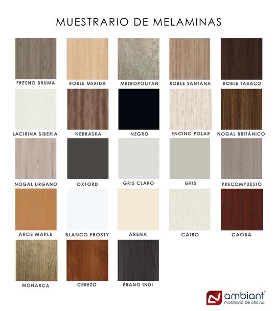 -Acabado pintura color negro, blanco o gris humo, credenza baja lateral en melamina, con 1 papelero largo, 1 de archivo largo.
