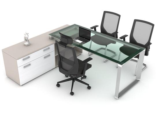 -Cubierta en vidrio, credenza baja lateral en melamina con 1 papelero largo, 1 de archivo largo.
