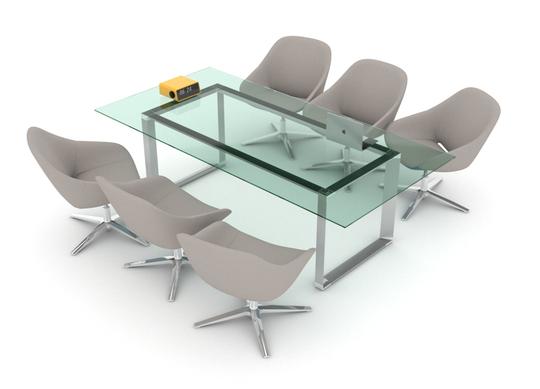 Mesa de juntas con cubierta de vidrio Tech SQ/Alum, con base metálica importada en acabado aluminio cepillado con esquineros metálicos cromados.